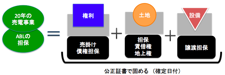 土地の担保、設備の担保も同様です。このように太陽光発電事業の3要素にピタリとはまる担保をが出来上がります。