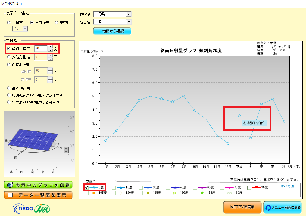 パネルが真南を向いていてパネルの傾斜角度が20度、